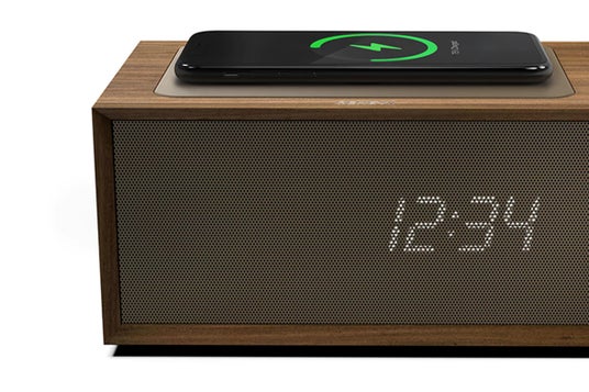天面のワイヤレスチャージ部分は、スピーカーグリルと同じカラーのリアルレザーを使用。刻印されたワイヤレス充電マークには、丁寧なエンボス加工が施され、スマートフォンやイヤホンなどのデバイスを置く位置が一目でわかり、就寝時や作業中にも素早く充電することができます。