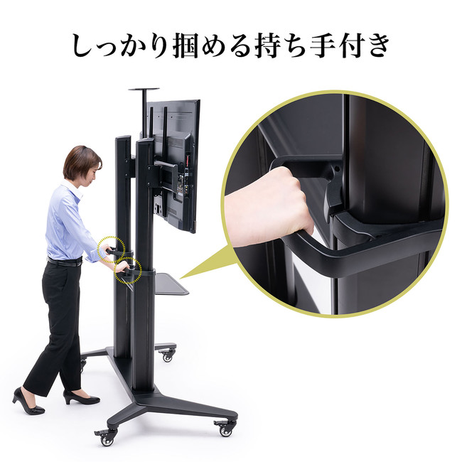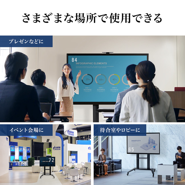 65型〜84型までのディスプレイの搭載が可能です。テレビ台の高さ変更が可能で、低くして会議などでの使用や高くして受付や展示会使用にも最適です。