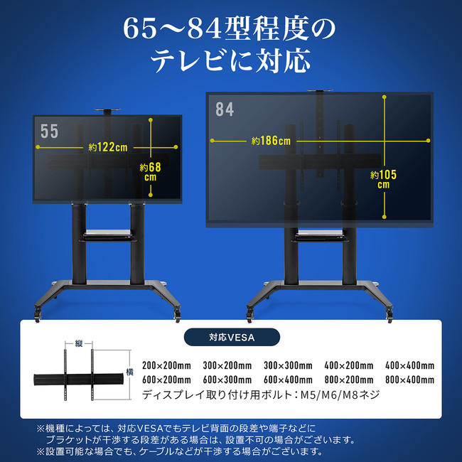 対応VESAは200×200、300×200、300×300、400×200、400×400、600×200、600×300、600×400、800×200、800×400mmに対応しています。