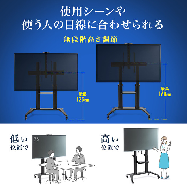 ディスプレイの高さを無段階で変えることができ、125〜160cm(ブラケット中心位置)に対応します。