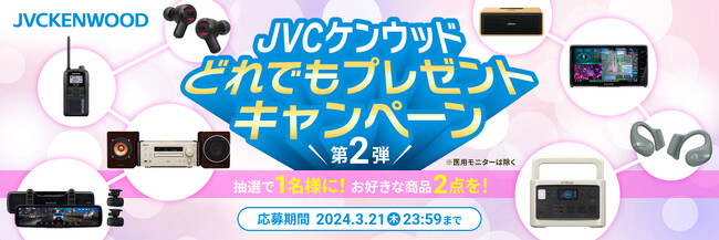 株式会社JVCケンウッドは、当社公式Xアカウントの「JVC」、「KENWOOD」、「Victor」と、公式オンラインストア「JVCケンウッドストア」との連動による“JVCケンウッド どれでもプレゼントキャンペーン 第2弾”を実施します。 抽選で1名様にJVCケンウッドストア内よりお好きな商品2点をプレゼント!応募期間は、3月21日(木)23:59までです。