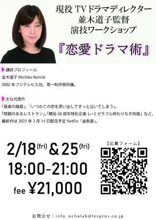 株式会社レプロエンタテインメントが運営する、エンタテインメントの溜まり場・御茶ラボにて、現役テレビドラマディレクターによるワークショップを開催することが決定しました。講師には株式会社フジテレビジョンのディレクターとして多くの恋愛ドラマの演出を手掛けられ、配信前からすでに話題となっている「金魚妻」(2022年2月14日Netflix配信予定)の監督をされた並木道子監督をお招きします。