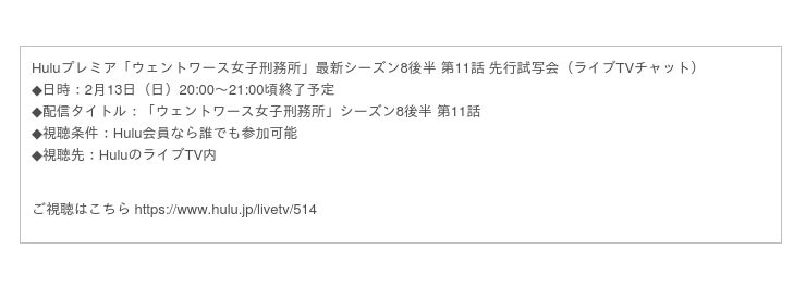 <HuluのライブTVチャットで一緒に観よう!>Huluプレミア「ウェントワース女子刑務所」シーズン8後半 2月13日(日)20時から先行試写会開催。さらに、一夜限りの特別映像も公開!