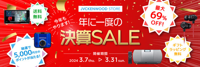 株式会社JVCケンウッドは、公式オンラインストア「JVCケンウッドストア」にて、決算SALEを実施中です。週替わり目玉商品や、本SALEだけの特別価格など、お得な商品を多数ご用意しております。キャンペーン期間は、3月7日(木)〜3月31日(日)23:59です。