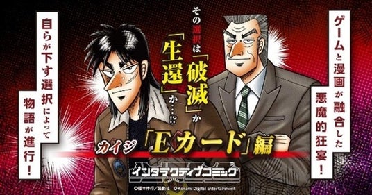 「賭博黙示録カイジ」にてカイジと利根川が繰り広げた「Eカード」の死闘が、インタラクティブコミック化されることが決定しました。インタラクティブコミックとは、読者の選択で展開が変化する新しいマンガです。選択肢によってストーリーが分岐する仕組みで、「カイジ」シリーズとの相性は抜群。カイジの目線で、利根川との「Eカード」対決に挑戦してください。