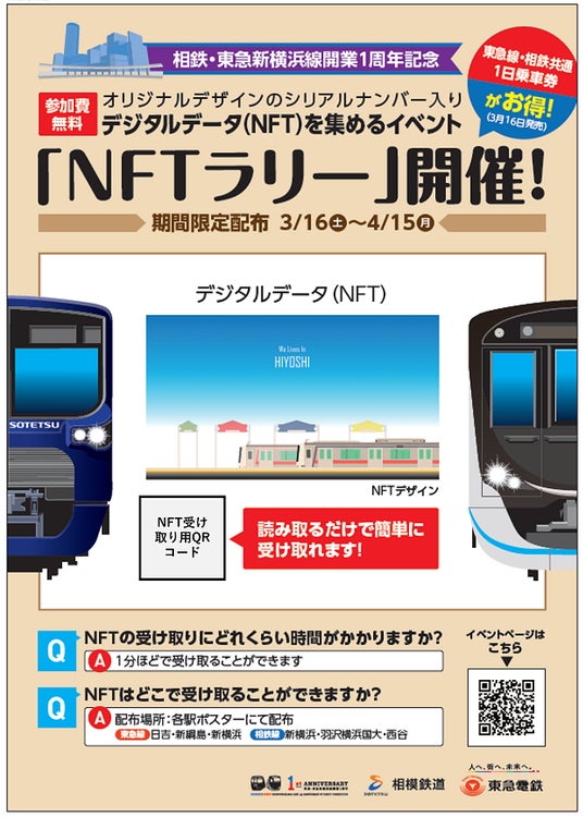 相鉄グループの相模鉄道株式会社(本社・横浜市西区、社長・千原 広司、以下「相模鉄道」)と東急電鉄株式会社(本社・東京都渋谷区、取締役社長・福田 誠一、以下「東急電鉄」)は、2024年3月16日(土)から、相鉄・東急新横浜線開業1周年を記念して、相鉄新横浜線および東急新横浜線の各3駅において、記念NFT※1(Non-Fungible Token:非代替性トークン)を配布し、相鉄線・東急線をめぐりながらNFTを集めていただく「NFTラリー」(以下、本イベント)を開催します。本イベントは、相鉄線・東急線をめぐりながら、相鉄・東急新横浜線の開業で一層利便性が向上した、両社沿線の魅力を表現したイラストや特別な写真を限定NFTコンテンツとして集めていただくことで、新しい沿線の楽しみ方や発見を提供することを目的に行うものです。NFTの配布は、相模鉄道においては今回が初めての実施となり、東急電鉄においては、2023年3月から「TOKYU RAILWAYS NFT PROJECT」(以下、本プロジェクト)を開始しており、東急新横浜線開業時には、記念NFTの無償配布やNFT保有者限定でお楽しみいただけるコンテンツを提供してきました。本イベントにおけるNFTの配布は、相鉄新横浜線の新横浜駅・羽沢横浜国大駅・西谷駅、東急新横浜線の新横浜駅・新綱島駅・日吉駅の計6駅で実施します。受け取っていただいたNFTは、本プロジェクトが実施するNFT配布イベントならびに公式オンラインストアにて販売予定のNFTとともに、コレクションが可能となっています。