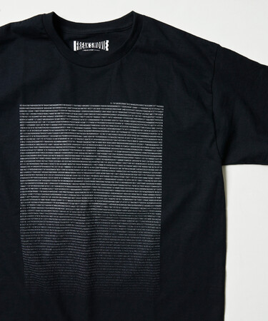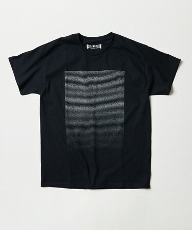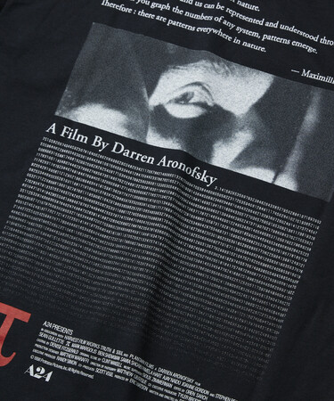 映画同様にモノクロでデザインされたTシャツのフロントは“π”の膨大な数字3.14159265358979323…だけがプリントされ、グラデーションとなって消えていきます。バックプリントには「1:数学は自然の言語である。2:私たちの身の回りのものはすべて、数で表し、理解することができる。3:あらゆるシステムの数字をグラフにすると、パターンが浮かび上がってくる。したがって、自然界のいたるところにパターンが存在する。- マクシミリアン・コーエン」という言葉の下に、主人公マックス・コーエンが目を開き、狂気に飲まれ「覚醒」していく様をプリント。さらにはダーレン・アロノフスキー監督の名前にくわえて、タイトルロゴ π の文字だけがキービジュアルに準じて赤く輝き、その横には「A24」のロゴが入ります。