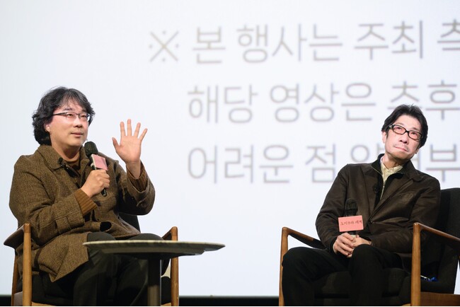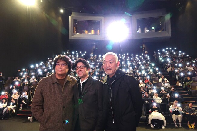 同日午後にシネコンのCGV龍山で行われた上映イベントでは、ポン・ジュノ監督が「ポンテール」(ポン・ジュノ+ディテール)という愛称に相応しく、阪本順治監督の繊細な演出が映画の随所に隠されていることを紐解きました。たとえば、「突如挿入されるカラーシーンが映画のリズムを生み出す演出意図は何か?」、「3年に及ぶ長い時間をかけて新しい章を作り出す際にどのようなリズムで続けるかをどう考えたのか?」、「映画全体の微妙なリズムを形成する美しいインサートショットをどこにどのように配置し、どのようなリズムで調整したか?」など、制作の秘密について質問を投げかけました。