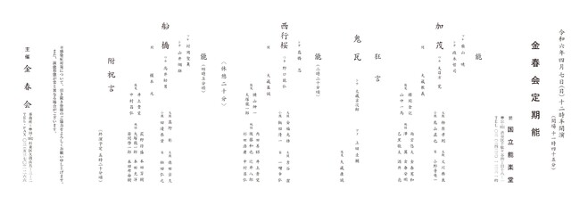 『金春会定期能 4月』が2024年4月7日 (日)に国立能楽堂(東京都渋谷区千駄ヶ谷4-18-1)にて上演されます。 チケットはカンフェティ(運営:ロングランプランニング株式会社、東京都新宿区、代表取締役:榑松 大剛)にて発売中です。