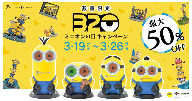 2024年3月19日(火)12:00から2024年3月26日(火)11:59まで、株式会社プライム1スタジオは「ミニオンの日キャンぺーン」を公式オンラインストアで開催いたします。「3(ミ)月2(ニ)0(オン)日=ミニオンの日」のお祝いに、対象ミニオン製品を数量限定・最大50%OFFのスペシャルプライスでご用意。オトクなキャンぺーンで日本だけの特別な記念日を盛り上げます。 プライム1スタジオ公式オンラインストア キャンペーンページ https://www.prime1studio.co.jp/sale.html