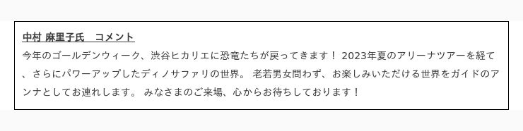 この度、恐竜とともに本公演を盛り上げるナビゲーター(サファリガイド)、アンナ役にDINO SAFARI4年連続出演の元AKB48の中村麻里子(なかむら まりこ)氏、リック役に柏木佑介(かしわぎ ゆうすけ)氏DINO SAFARI公演初出演が決定しました。(次ページにナビゲーター(サファリガイド)のプロフィール、意気込みをそれぞれ記載しております。)