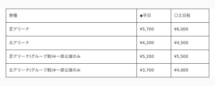 ※芝アリーナは芝生の上に座ってご覧いただくお席です。丘アリーナは、椅子やひな壇にお座り頂くお席です。