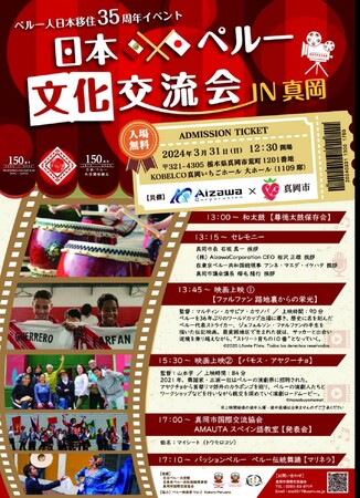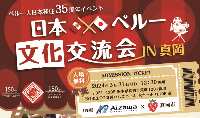 【株式会社Aizawa Corporation】は、真岡市で開催される『日本×ペルー文化交流会 in 真岡』をご案内いたします。ペルーと日本の修交150周年を記念し、ペルー人の日本移住35周年も重なるこの素晴らしいイベントでは、ペルーの映画、伝統舞踊などが楽しめます。日本×ペルーの文化の魅力を感じるこの機会をお見逃しなく!