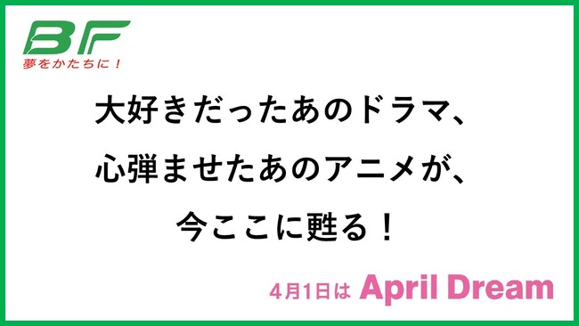 昭和の名作、想い出のアニメ、甦るヒーローをテーマにDVD&Blu-rayの企画、発売を行うベストフィールドは、4月1日を夢を発信する日にしようとするApril Dreamに賛同しています。このプレスリリースは「ベストフィールド」の夢です。