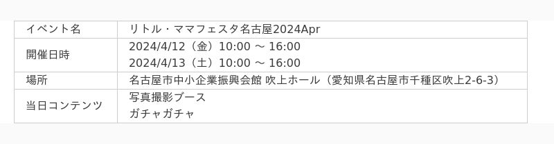 リトル・ママフェスタはママもパパも、おじいちゃんもおばあちゃんも、子育てに関わる全ての人が楽しめる国内最大級のファミリーイベントです。当日はハイハイレース、撮影会などの人気企画をはじめ、子育て応援企業やママたちによるたくさんのブースが出展します。昨年末に開催されたリトル・ママフェスタ名古屋2023Novには6000人以上が来場しました。