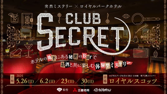 松竹株式会社(代表取締役社長 高橋 敏弘 本社:東京都中央区、以下「松竹」)は、三菱地所株式会社(代表執行役 執行役社長 中島 篤 本社:東京都千代田区、以下「三菱地所」)の協力のもと、体験型エンタテインメント「突然ミステリー×ロイヤルパークホテル『CLUB SECRET(クラブ シークレット)』」を企画・製作し、ロイヤルパークホテル(東京・日本橋)地下1階 メインバー「ロイヤルスコッツ」にて開催いたします。