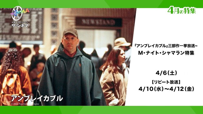 洋画専門チャンネルザ・シネマ(AXN株式会社、本社:東京都渋谷区、代表取締役社長 大園天樹)では、『シックス・センス』で一躍有名になり、2024年も監督作・プロデュース作が目白押しのM・ナイト・シャマラン監督を特集いたします。衝撃のどんでん返しで最後まで目の離せない5作品を4月6日(土) ※リピート放送:4月10日(水)〜12日(金) に一挙放送いたします。