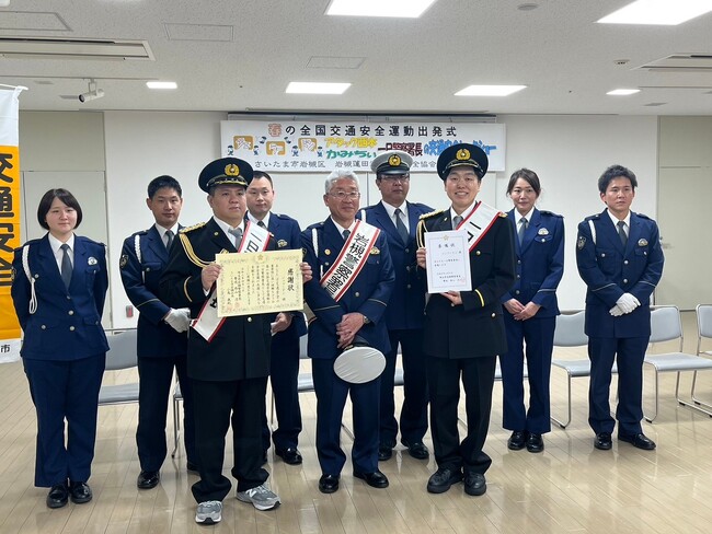 さいたま観光大使「大宮セブン」のメンバーであるジェラードン(アタック西本、かみちぃ)が埼玉県 岩槻警察署の1日警察署長に就任し、「令和6年春の全国交通安全運動出発式」に出演しました。委嘱式で1日警察署長に就任した2人は交通安全宣言を読み上げ、ご来場いただいた方々へKEEP38プロジェクト(道路交通法38条「歩行者優先義務」遵守の取り組み)、自転車乗用時のヘルメット着用義務等を訴えました。