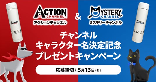 キャラクター名の決定を記念して、アクティーとミスティーがデザインされたオリジナルのステンレスサーモボトルを抽選で20名様にプレゼントします。詳しくは、アクションチャンネルとミステリーチャンネルのWEBサイトをご覧ください。