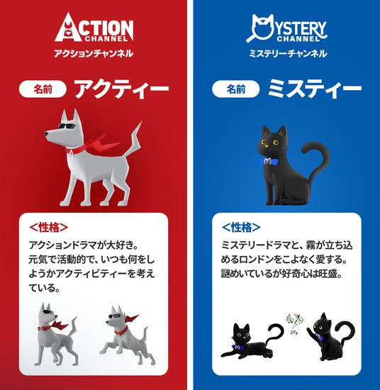 昨年10月にチャンネル名を「アクションチャンネル」「ミステリーチャンネル」にリニューアルし、よりチャンネルに親しみを持っていただきたいという思いでキャラクターを誕生させました。アクションチャンネルのキャラクター(犬)は、元気で活動的な意味を込めた「アクティー」に、ミステリーチャンネルのキャラクター(猫)は、霧が立ちこむように謎めいたイメージから「ミスティー」と命名しました。両チャンネルの“顔”として、視聴者の皆様により身近に感じていただくとともに、長く愛していただけるよう「アクティー」「ミスティー」を通じて様々な展開をしてまいります。
