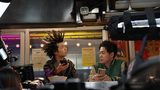 撮影は、東京都大田区のラーメン屋で行われました。カジュアルな服装で撮影入りした成田凌さん。外国人スタッフ・共演者と動きや感情の変化など、細かい部分までこだわりながら、終始程よい緊張感に包まれた撮影現場となりました。トリッキーな動きで写真を撮るスパイキーヘアの男性に、成田さんは困惑しながらも「Galaxy AI」機能を駆使して写真を撮り、お互い笑顔になるシーンも。また、撮影中ラーメンをたくさん食べる成田さんも印象的です。