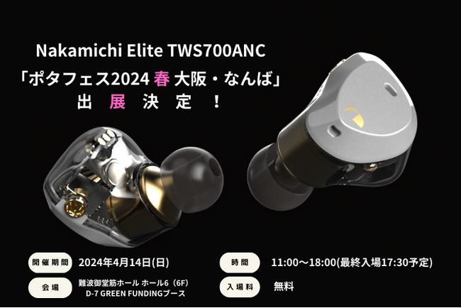 ?三海株式会社(本社:大阪府堺市堺区、代表取締役:伴場 義通)は、2024年4月14日(日)になんば御堂筋ホール6Fで開催される「ポタフェス2024春 大阪・なんば」にNakamichiイヤホン Elite TWS700ANCを出展します。 ぜひGREEN FUNDINGブースまでお立ち寄りください! また当日は簡単な試聴アンケートご回答いただいたお客様限定のプレゼントもご用意しています。