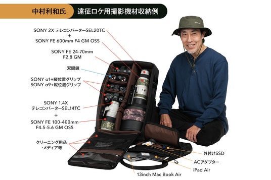 野鳥写真家 中村利和氏監修。野鳥撮影遠征時の機材がまとめて収納出来るプロ仕様の大型リュック。