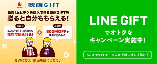 概要:映画GIFT2,000円分をLINEギフトの公式キャンペーンページから購入しプレゼントすると、ご自身にも映画GIFT500円分をプレゼント
