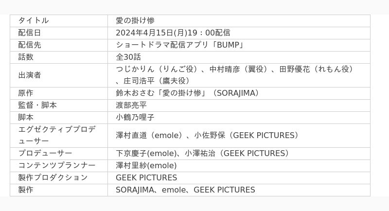縦型ショートドラマ版「愛の掛け惨」の監督・脚本は映画「3月のライオン」の脚本を務めた映像ディレクター渡部亮平が務め、制作は数多くの映画や広告作品などを手掛けるギークピクチュアズが担当しています。
