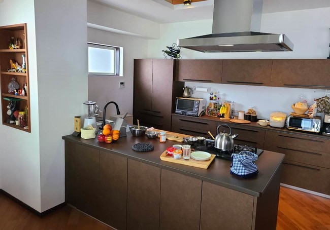 今回、主人公のシロがホームステイする小林真の家にトクラスキッチンを納入いたしました。焼き締め陶の風合いを持つバーストブラウンのカウンターとエイジングゴールドの扉を組み合わせたキッチンは、上質な部屋にマッチしながらも、あたたかみのある空間作りの一端を担っています。