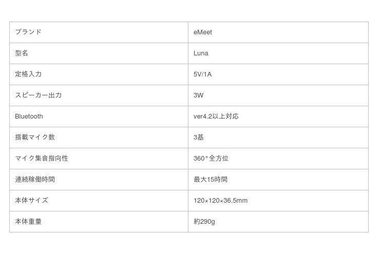 『eMeet Luna』は、持ち運びに適したポータブル型の高性能マイクスピーカーです。多人数の声を拾い上げることができ、約5〜8名程度の参加する会議通話での使用に適しています。