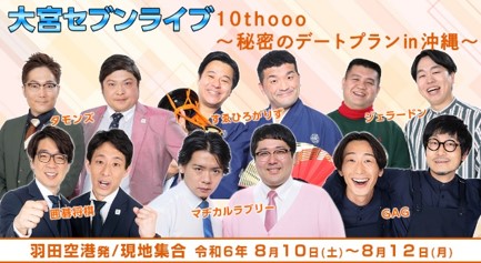 2014年に誕生したマヂカルラブリー、囲碁将棋、GAG、すゑひろがりず、タモンズ、ジェラードンからなる大宮ラクーンよしもと劇場の看板ユニット「大宮セブン」が、結成10周年を記念し「大宮セブンライブ 10thooo〜10周年の家族旅行〜」と題して沖縄、大阪、大宮を巡る旅行(ツアー)の実施が決定し、4月17日(水)に大宮セブンが日ごろ出演しているカー用品店「スーパーオートバックス大宮バイパス店」が運営する劇場公式YouTube『お笑いバックスちゃんねる』にて発表されました。ツアー開催に伴い、大宮セブン10周年ver.の新しいロゴも解禁されました。