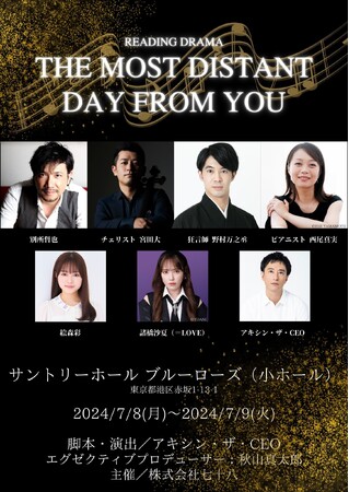 株式会社七十八(代表取締役:秋山真太郎)および同社内のプラットフォーム「STAND FOR ARTISTS」主催、朗読劇『THE MOST DISTANT DAY FROM YOU』が2024年7月8日(月)〜9日(火)にTHE MOST DISTANT DAY FROM YOU」をサントリーホール ブルーローズ(東京都港区赤坂1-13-1)にて上演されます。 チケットはカンフェティ(運営:ロングランプランニング株式会社、東京都新宿区、代表取締役:榑松 大剛)にて発売予定です。