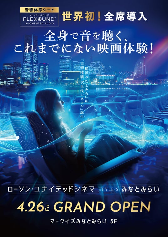 今回オープンする「ローソン・ユナイテッドシネマ STYLE-S みなとみらい」は、世界で初めて全スクリーン・全席に“没入型”音響体感システム【FLEXOUND Augmented Audio(TM)】(以下、「FLEXOUND」)を導入した映画館です。FLEXOUNDが内蔵されたシートの枕や背部から発する「音と振動」によって、身体全体で音を感じることができ、映像とともにより映画の本質的な価値をお楽しみいただけます。また、同館では、ローソン店舗で販売しているオリジナル冷凍デザートをローソン・ユナイテッドシネマのオリジナルパッケージで提供するほか、ナッツやチョコレートなどのナチュラルローソン菓子も販売いたします。