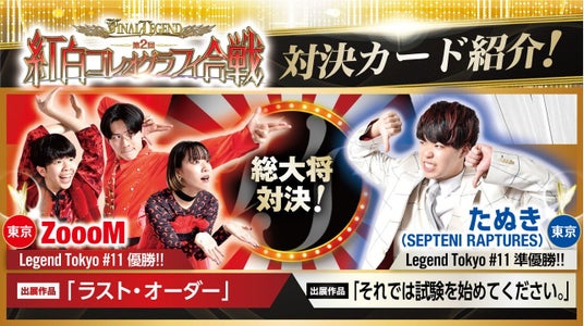 ■優勝、準優勝を争った若き才能同士が運命の再戦! 大トリを飾るのは、昨年度『Legend Tokyo Chapter.11』で優勝を争った次世代の“新星”ZoooMとたぬきによる総大将対決! 優勝作品、準優勝作品がそれぞれパワーアップを果たして再登場。若くしてプロリーグや商業舞台で活躍する彼ら。まさに新時代の雌雄を決する、この戦いをお見逃しなく!