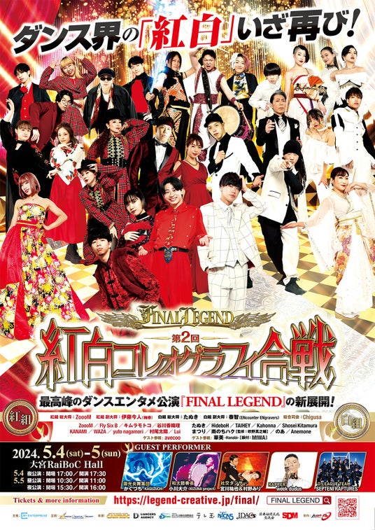 コレオグラファー(振付師)の才能に注目した最高峰のコンテスト『Legend Tokyo』が贈るダンスエンタメ公演『FINAL LEGEND』。その新シリーズ「紅白コレオグラフィ合戦」が、大盛況となった昨年度に続いてゴールデンウィークの5/4(土)-5(日)に開催! まるで「紅白歌合戦」のように、名作ダンスナンバーが「紅組」「白組」に分かれ、この日限りのエンタメな仕掛けとともに披露されます!
