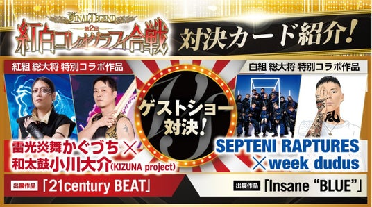 対する白組のゲストショーは、総大将たぬきが所属するD.LEAGUEチーム“SEPUTENI RAPUTURES”。YouTube再生回数140万回超を誇るチームタイトル曲「Insane “BLUE”」を、新世代ラッパー“week dudus”の生ライブとコラボした特別版で初披露!