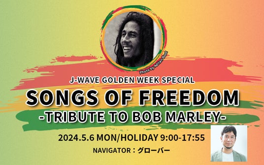 ラジオ局J-WAVE(81.3FM)では、5月6日(月・振休)9:00〜17:55、音楽で世界に大きな影響を与えたボブ・マーリーの色褪せぬ魅力に迫る特別番組『J-WAVE GOLDENWEEK SPECIAL SONGS OF FREEDOM -TRIBUTE TO BOB MARLEY-』(ナビゲーター:グローバー)を9時間にわたり放送いたします。