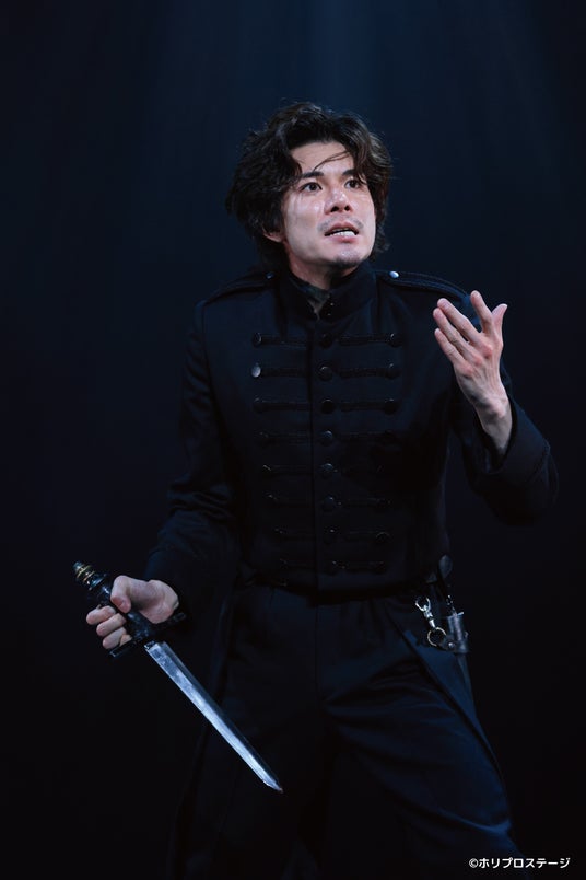 タイトルロールを担うのは、ミュージカルでもストレートプレイでも人物の真情が鮮やかに伝わる柿澤勇人。劇中で「ことば、ことば、ことば」と語るように、膨大な台詞を操るハムレットはまさに言葉が命と言える役だ。柿澤は明晰な台詞術という武器だけに頼らず、本来快活だったはずのハムレットが怒涛のごとく運命に呑み込まれ歯車が狂っていく様を、高い熱量と緩急自在な語り口で一言一言粒立てるように表現していく。一本気で、激情に駆られやすく、復讐を誓ったのに逡巡し、恋人を心ならずも拒絶し、母への愛憎に揺れる一方で、親友や役者には惜しみない信頼と友愛を示す。不完全で不器用な、人間くさいハムレットが愛おしくも痛ましい。