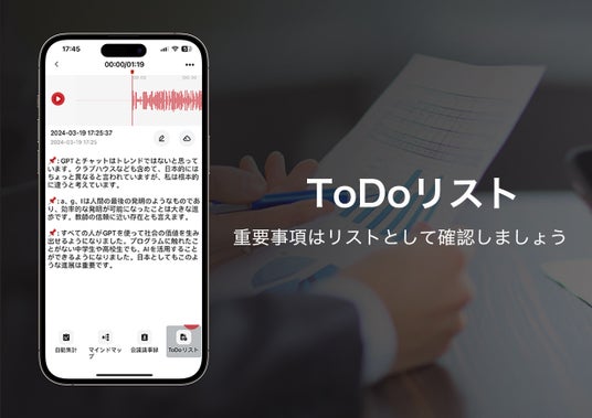 ・To-Do リスト: 転写されたテキストを注意深く分析し、重要な情報を抽出することで、アプリケーションは特定のタスクとアクション ステップを認識し、整理された To-Do リストを作成できます。