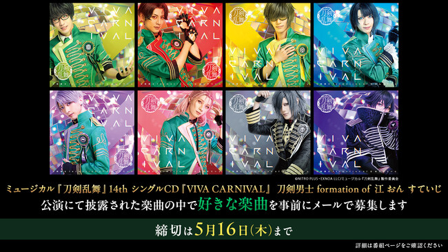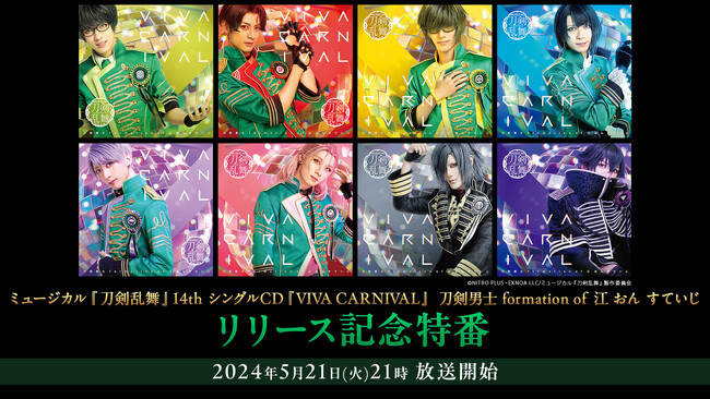 「14th シングルCD『VIVA CARNIVAL』 刀剣男士 formation of 江 おん すていじ」のリリースを記念した特番が5月11日(火)21時より、ニコニコで生放送される。