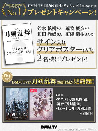 独占見放題配信『映画刀剣乱舞-黎明-』、見放題配信『映画刀剣乱舞-継承-』DMM TVにて4月の国内映画ランキング1位を獲得!