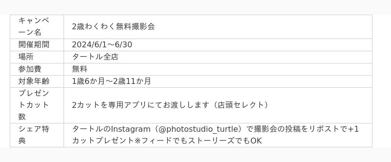 タートルが「2歳わくわく無料撮影会」を6/1(土)から開催