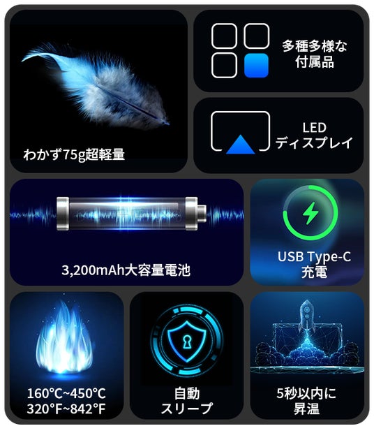 【75g超軽量・最大温度450°C・瞬時に200℃加熱可能・Type-Cポート】