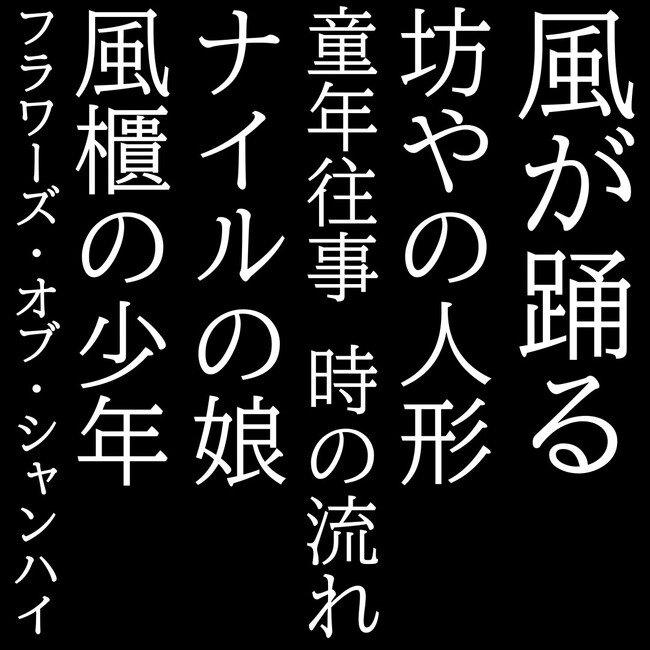 『ナイルの娘【4Kデジタル修復版】』 (C) 1987 Scholar Multimedia Co., Ltd /(C) 2016 Taiwan Film and Audiovisual Institute All rights reserved. 『フラワーズ・オブ・シャンハイ【4Kデジタル修復版】』 (C) 1998/2019 侯孝賢映像製作社・松竹株式会社 『風が踊る【HDリマスター版】』 (C) 1982 Kam Sai (H.K.) Company / (C) 2018 Taiwan Film and Audiovisual Institute. All rights reserved. 『風櫃(フンクイ)の少年【HDリマスター版】』 (C) 3H Productions LTD, All Rights Reserved. 『坊やの人形【HDリマスター版】』 (C) 2015 Taiwan Film and Audiovisual Institute. All rights reserved. 『童年往事/時の流れ』 (C) 2014 Taiwan Film and Audiovisual Institute. All rights reserved. 『台北暮色』 (C) 3H Productions Ltd
