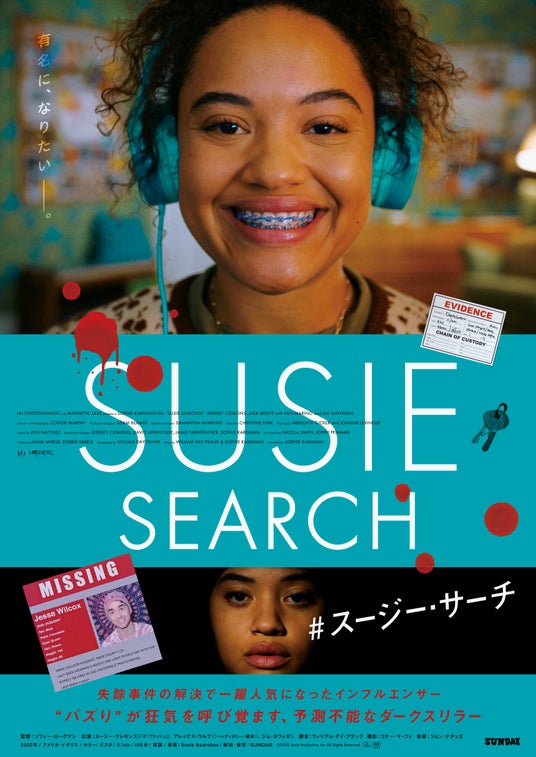 また、併せて解禁となった本ビジュアルでは、カラフルな歯列矯正が目を惹く、満面の笑みを浮かべたスージーが大きく配されたインパクトのあるものとなっている。一方、その下には対照的な表情をしたスージーが暗闇から不気味に浮かび上がり、「有名に、なりたい――。」というメインコピーと相まって、フォロワーが増えた彼女がどのように変化していくのか!?想像を掻き立てるビジュアルとなった。さらに、周囲に「鍵」や「血痕」、「行方不明となったジェシーの捜索願い」なども散りばめられており、世界を魅了した予測不能なダークスリラーの公開が待ち遠しくなる解禁となった。