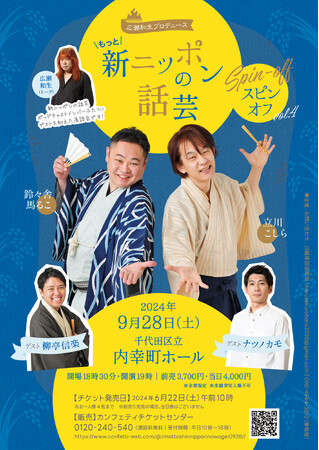 川鶴落語俱楽部主催、『広瀬和生プロデュース もっと! 新ニッポンの話芸スピンオフ vol.4』が2024年9月28日(土)に千代田区立内幸町ホール( 東京都千代田区内幸町1丁目51)にて開催されます。 チケットはカンフェティ(運営:ロングランプランニング株式会社、東京都新宿区、代表取締役:榑松 大剛)にて発売予定です。