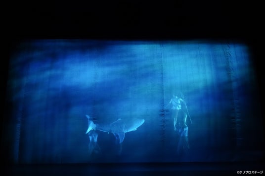 幕開けから驚かされるのは、コナンが巨大ザメと死闘を繰り広げる海中のシーン。アニメ版でも印象的だった第1話冒頭のシーンが、そのまま舞台上に現出する。紗幕と照明と音楽によって不穏な海中が生み出されたかと思うと、そこに漂うのはリアルな肉体。水中を得意とするコナンらしく、巨大なサメを相手にしながらも、その体はどんどん躍動していく。『未来少年コナン』をどうやって舞台に?そんな心配を軽く吹き飛ばす、鮮烈なオープニングとなった。