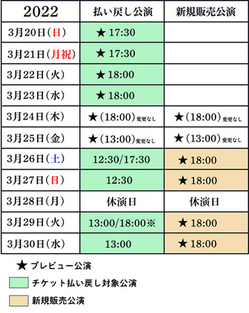 また、開幕の遅れにより、本公演を予定していた日程にプレビュー公演をおこなう必要が生じますため、3月26日から30日の公演は全て一度公演中止とさせて頂き、新たにプレビュー公演として販売をいたします。