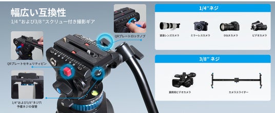 【幅広い互換性】クイックリリースプレートを装備し、標準の1/4インチおよび3/8インチネジが取り付けられているため、ビデオ雲台はほとんどのカメラおよびビデオカメラと互換性があります。ビデオ雲台には、3/8インチのネジ穴が1つ付いており、外部デバイスを拡張するためのさまざまなニーズに対応します。